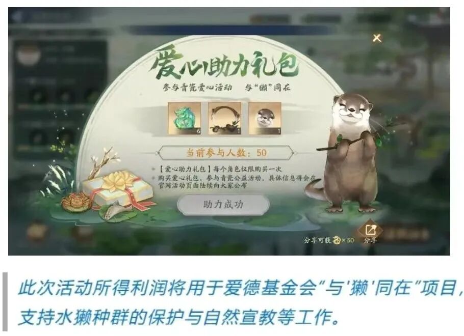 ◆ 礼包介绍:购买『爱心助力礼包』,即可获得水獭限定动态头像及头像框!该礼包每位大侠仅可购买一次。购买爱心礼包,参与青瓷公益活动吧!具体信息将会在官网活动页面陆续向大家公布。
