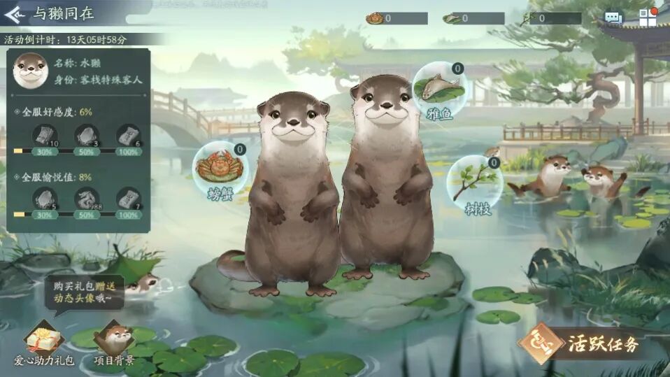 当水獭的“全服好感度”和“全服愉悦值”达到指定档位,即可获得祈愿符、五系招募石、金龙、新安当票奖励!大侠们献出的爱心一定会得到最好的回报。