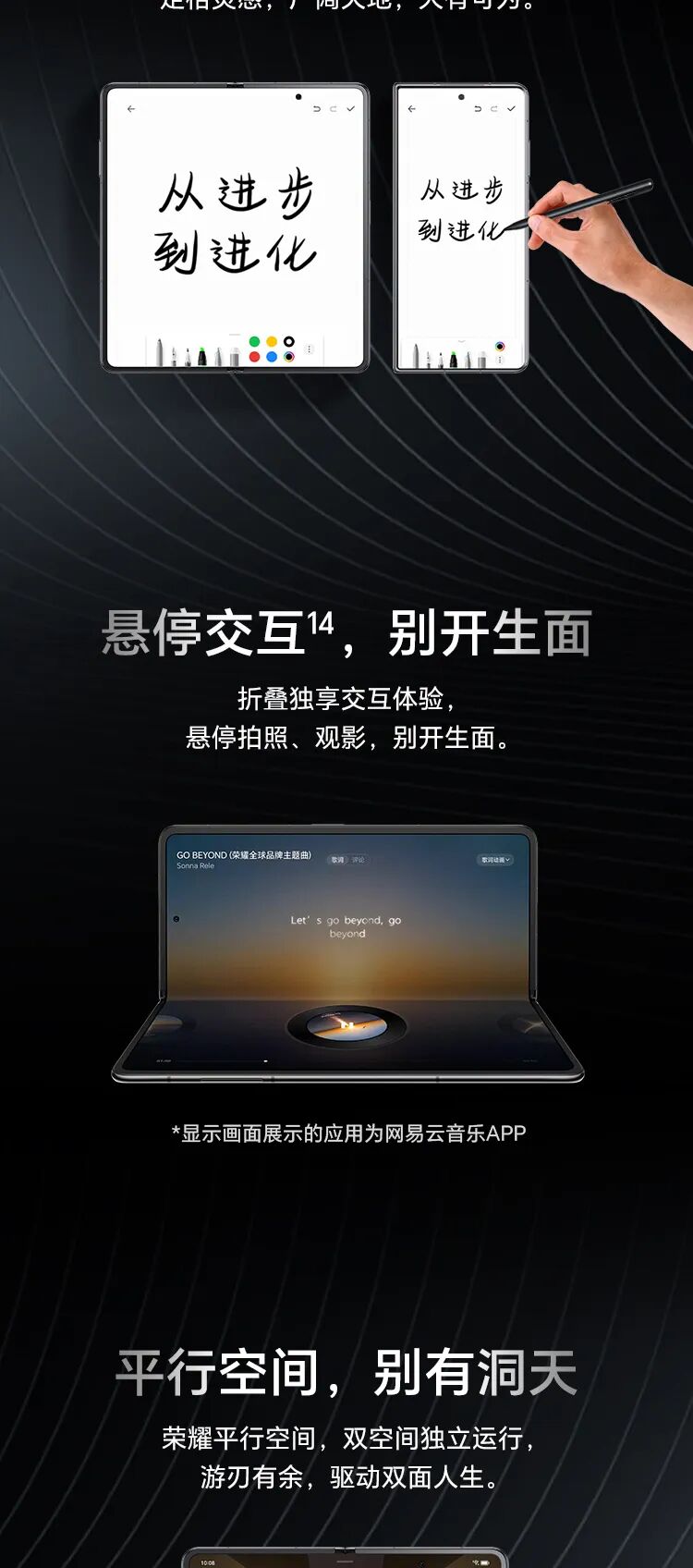 荣耀自研鲁班钛金铰链,SGS高可靠折叠品质金标认证,恒久稳定突破桎梏,铸就不朽传奇。荣耀0齿轮一体式榫卯结构,承袭经典,精准操控,随处悬停,开合俯仰之间,纵享丝滑屏展。