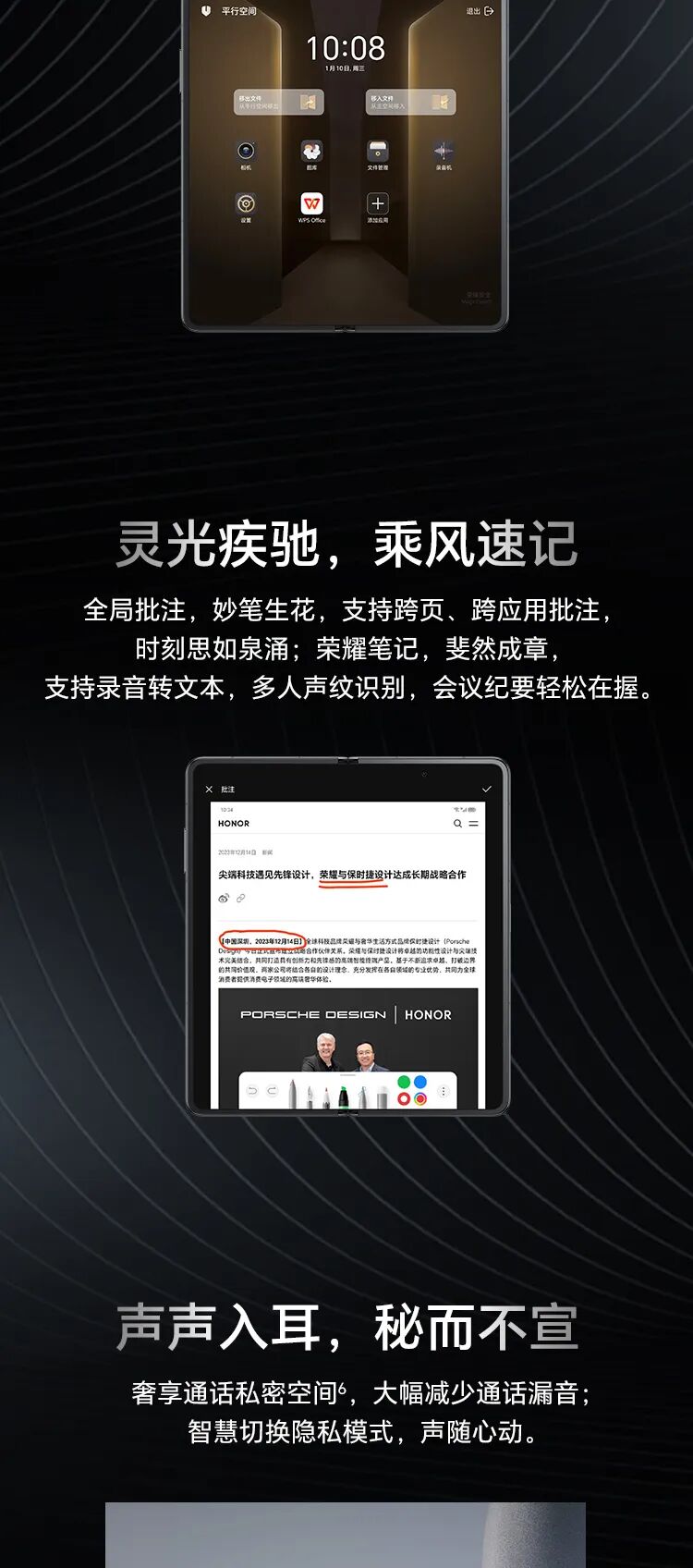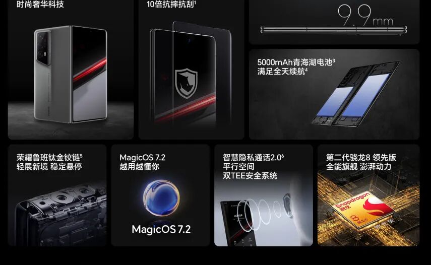 经久动能,一触即发,荣耀Magic V2 RSR保时捷拥有5000mAh青海湖双电池,强劲续航,从早到晚恣意驰骋,经久快意无与伦比。