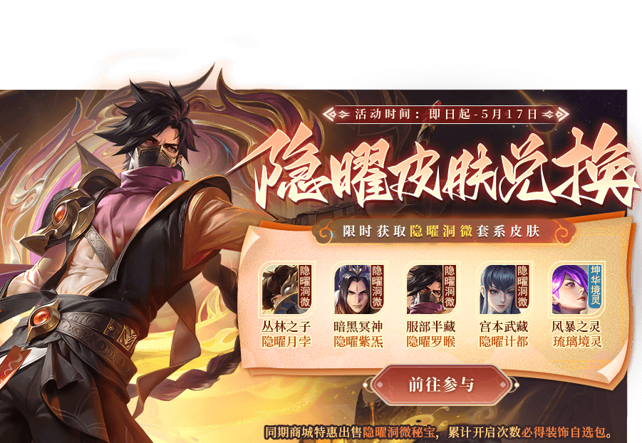 隐曜皮肤兑换开启!限时获取宫本武藏-隐曜计都、服部半藏-隐曜罗睺、暗黑冥神-隐曜紫炁、从林之子-隐曜月孛、风暴之灵-琉璃境灵等好礼!