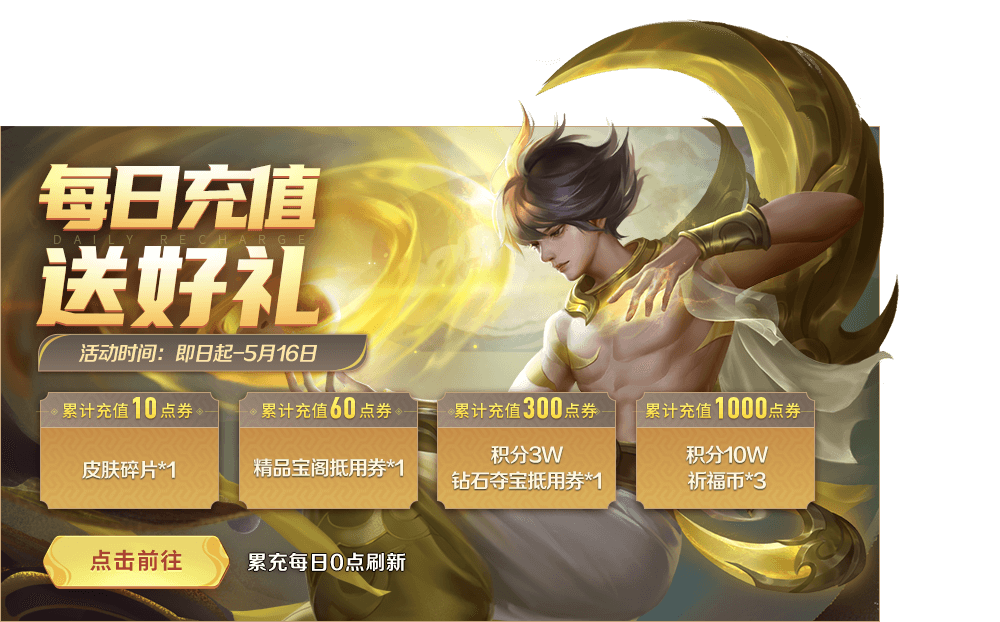 活动期间,每日充值指定额度即可获得皮肤碎片、精品宝阁抵用券、海量积分、钻石夺宝抵用券、祈福币等精彩奖励,好礼不容错过!