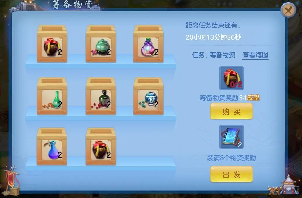 3)人物≥60级可在丝绸之路界面领取任务,筹备物资可获得威望,每周可完成3次任务。