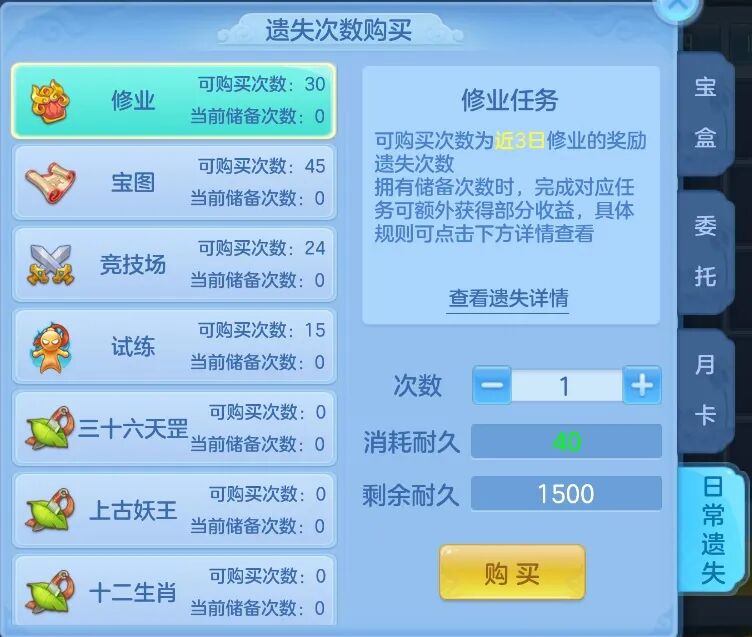 1)支持购买上古妖王、三十六天罡、十二生肖的奖励遗失次数;