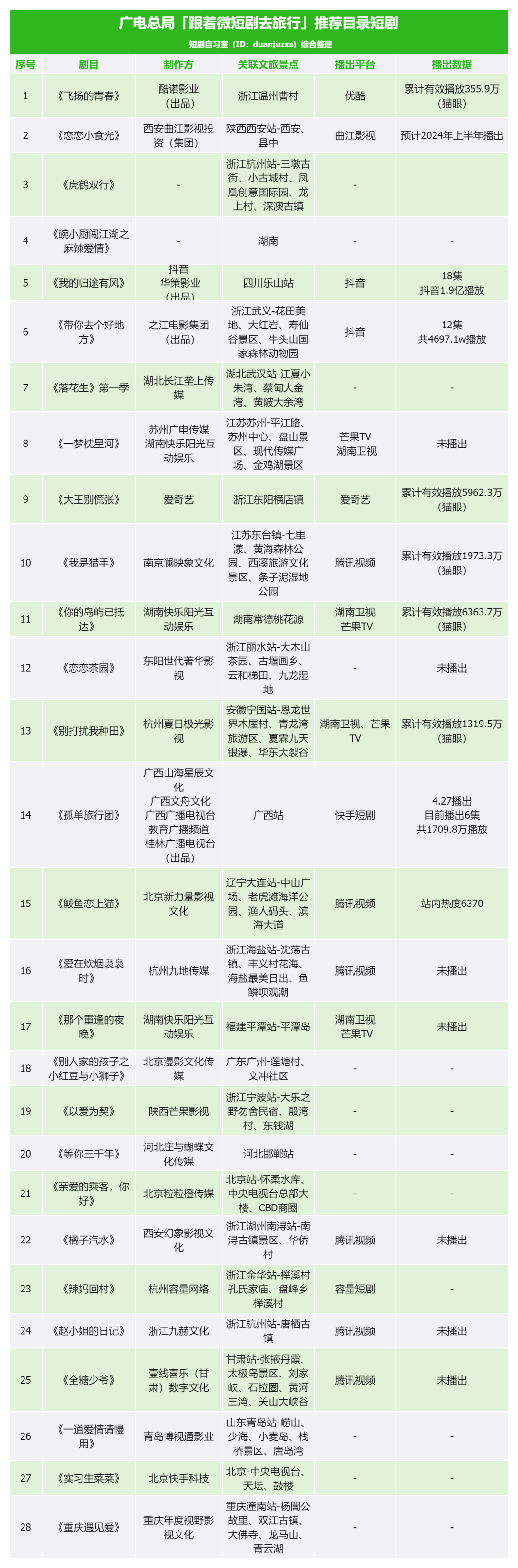 广电总局计划一年创作播出100部优质文旅短剧,如今已公布两批、累计28部推荐作品,完成了三分之一,但其中没有大爆款,热度较高的《我的归途有风》播放量近2亿,远未达到出圈量级。
