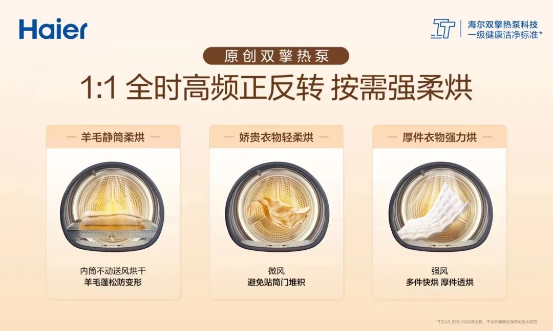 相比于传统干衣机的单一电机,海尔双擎热泵科技采用了独立变频驱动电机+独立直驱变频风机,可实现1:1全时高频正反转,让衣物充分抖散不抱团;再匹配最佳烘干参数,56度黄金温度,让衣物烘得又快又透。