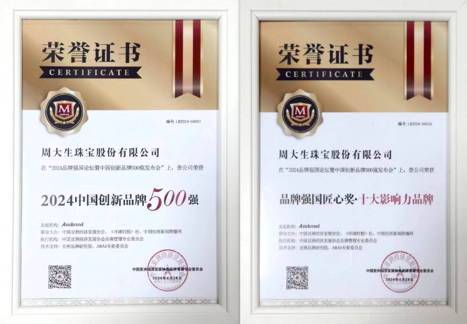 摘要:周大生荣膺“2024中国创新品牌500强”、“品牌强国匠心奖·十大影响力品牌”两项大奖