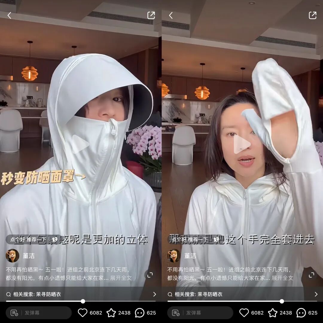 抖音多个防晒话题播放量超百亿次,小红书的防晒笔记篇数超过1030万虽然防晒知识点琳琅满目,但近年来物理防晒优于化学防晒的呼声日益明显,即防晒衣效果优于防晒霜。有博主在相同的日晒环境下测评过防晒霜与防晒衣的效果,通过对比皮肤状态发现,防晒衣的效果更佳。同时,防晒衣随穿随走,更加轻巧灵活,不需要像防晒霜一样经历涂抹、卸妆等步骤。前几年网友们还在质疑头戴“脸基尼”的青岛大姨,现如今纷纷理解并成为青岛大姨,防晒衣、防晒帽、防晒面罩一个不落,力争从头武装到脚。为了满足好看易搭配的穿着需求,防晒衣的剪裁设计逐步向时尚感靠拢,由功能性外套向日常百搭外套转型。防晒衣主打轻薄、低饱和度,与时下流行的薄荷曼波穿搭相适配。在小红书上,“防晒衣穿搭”相关笔记超过63万篇。博主“一小只细细”在小红书视频笔记中展现了防晒衣搭配连衣裙、半裙、瑜伽裤的3种穿搭思路,凸显该款防晒衣的灵活百搭,获赞2.7万。![]()