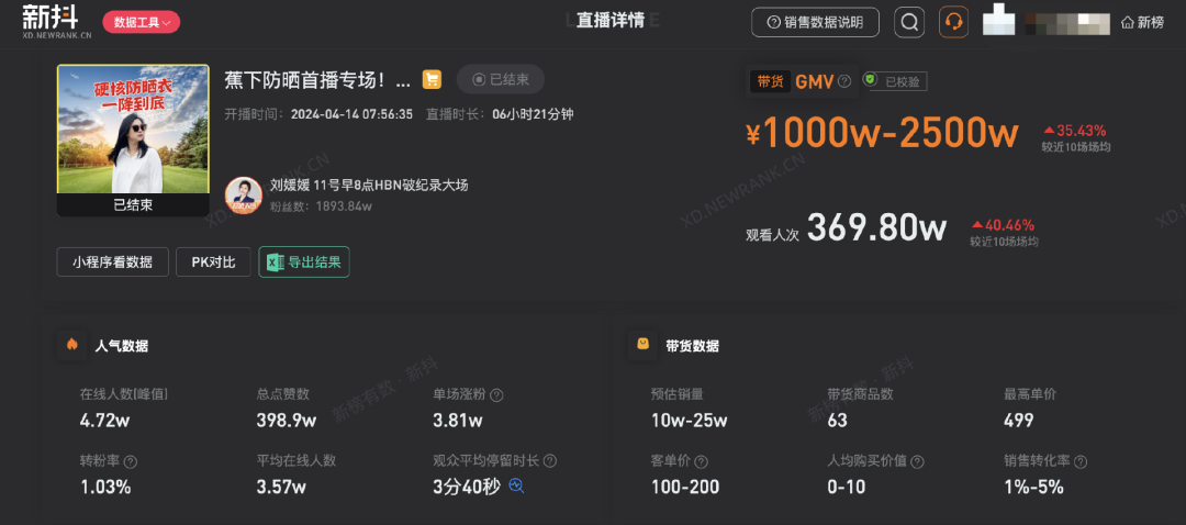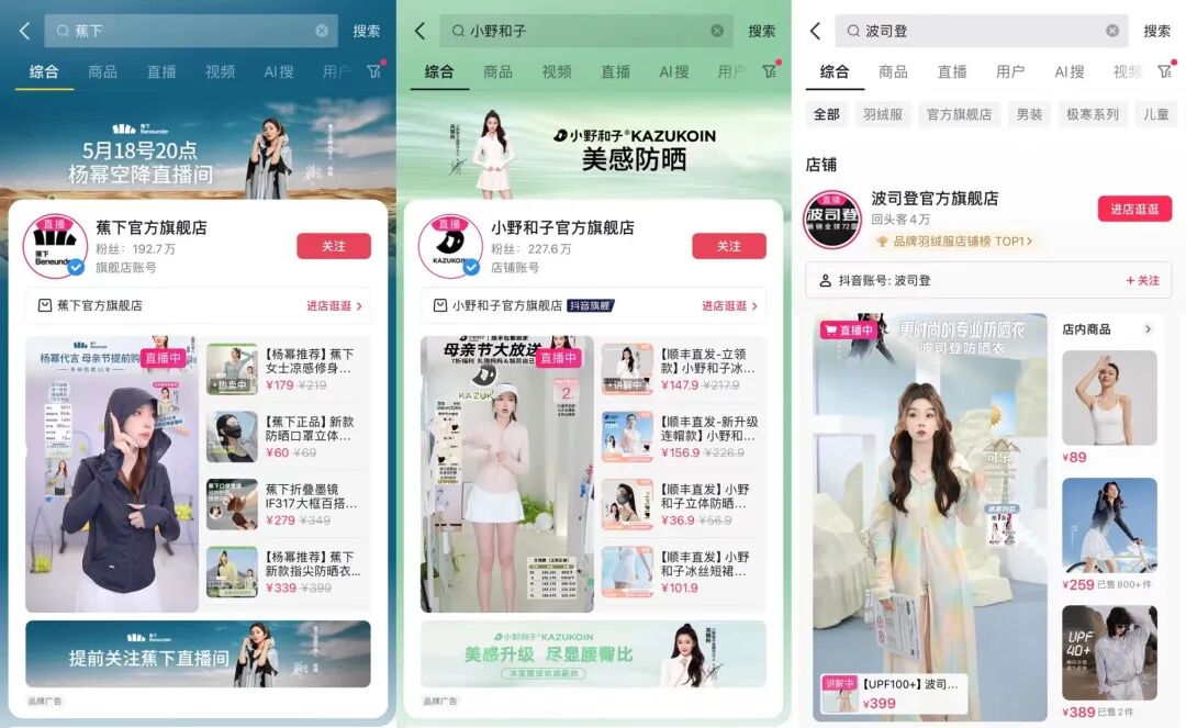 4月14日,拥有1800万粉丝的博主“刘媛媛”在抖音开启了蕉下专场直播,预估累计销售额达到1000万-2500万元,观看人次达到369万,销售额排名第一的是蕉下某款防晒衣,达到250万-500万元,依次再是防晒口罩、防晒帽、防晒墨镜等周边产品。值得一提的是,在小红书、抖音营销动作活跃的多为新锐品牌,很少设有线下门店,互联网是其带动销售的大本营。相比之下,波司登、蕉下等成熟品牌的营销打法更偏线下与传统。五一期间,波司登现身北京草莓音乐节,吸引年轻人打卡关注旗下防晒衣产品。在北上广多个城市的地铁、写字楼,也能看到波司登防晒衣广告。继2023年签约周杰伦后,蕉下在今年3月官宣杨幂为品牌全新代言人。代言人效应帮助蕉下拓宽消费者人群维度,蕉下CMO果小在剁椒Spicy采访中表示,因为签约周杰伦,蕉下开始广泛吸引男性用户,去年冬季周杰伦同款冲锋衣销量不错,男性用户占比达40%。![]()