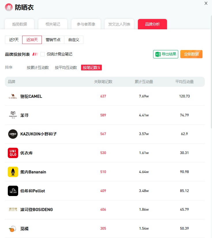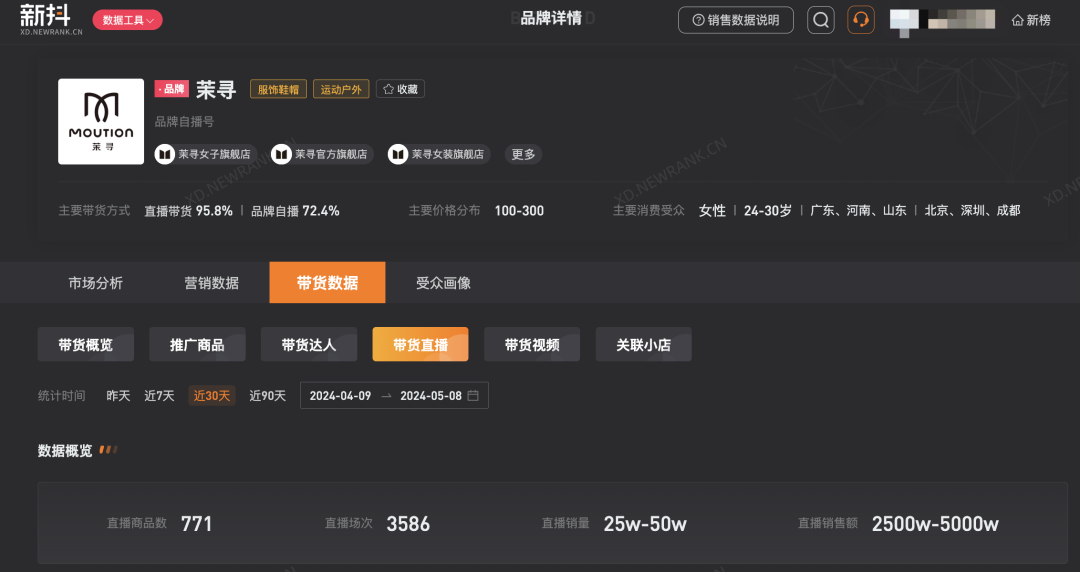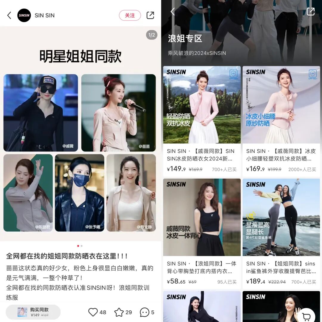 这种软植入的形式常见于商业笔记中。新红数据显示,近30天内,含有#防晒衣#话题的小红书商业笔记达到2116篇,骆驼、茉寻、小野和子的投放数量分列前三,均超过550篇。值得一提的是,茉寻、小野和子在内的多个新锐网红品牌奉行大单品策略,根据季节不同灵活调整产品线,此前这两个品牌在秋冬季节主推的便是光腿神器,其中小野和子更在抖音创下了30天累计破亿的销售额。除了广撒网的KOC种草笔记,新锐品牌也借助明星营销打开局面。近期《浪姐5》中,SINSIN品牌代言人戚薇在内的多位女明星身穿防晒衣现身排练,加速品牌破圈。SINSIN小红书账号中设置了“浪姐专区”,便于消费者购买明星同款。据新榜旗下抖音数据工具新抖,近30天内,点赞量前3的防晒衣商单视频依次来自“王七叶”、“白昼小熊”和“方圆”,合作品牌分别是小野和子和茉寻。在这3条视频中,几位博主都没有循规蹈矩地介绍防晒衣的材质功能,而是结合穿着场景展现品牌优势。据新抖数据,近30天内,茉寻、小野和子、SINSIN的累计关联直播场次均超过2500场,茉寻的直播场次居于第一,达到3586场,累计直播销售额在2500万-5000万元。在这其中,品牌自播与达播的比例接近7:3,消费者中有9成是女性,18-30岁群体占比达到67%。![]()
