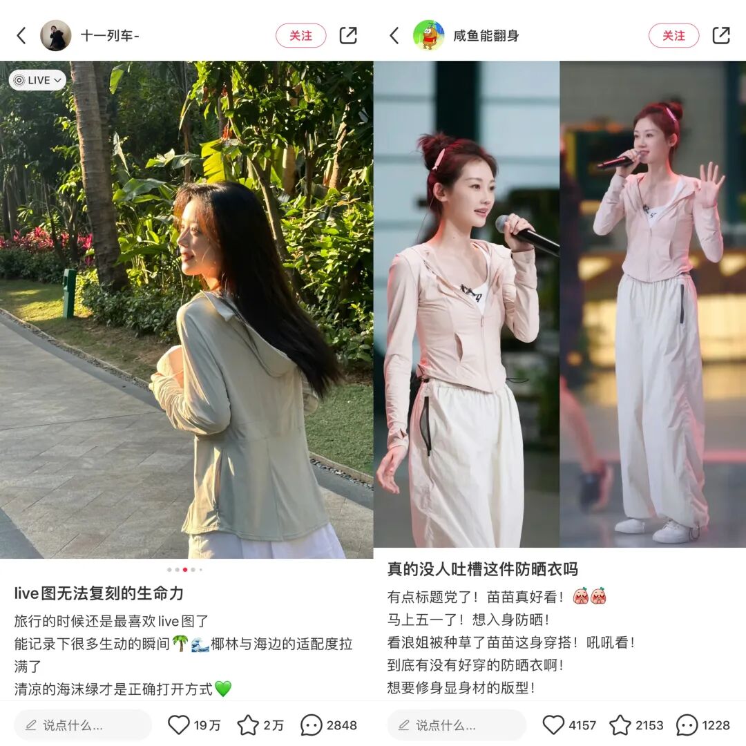 以“防晒衣”为关键词在小红书进行搜索,显示有超过96万篇笔记和91万件商品,轻盈、透气、修身等特点被频繁提及。防晒衣不再局限于功能性,也卷向颜值穿搭赛道,剪裁更为简约时尚,进一步拓宽穿着场景,进可当春夏外搭,退可做打工人工服,就连近期综艺《浪姐5》中也有明星穿着防晒衣的身影。![]()