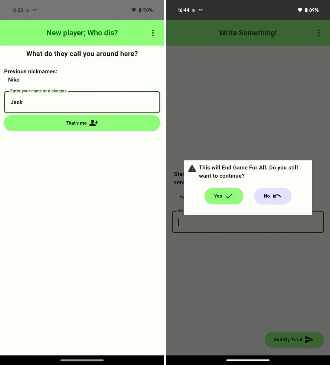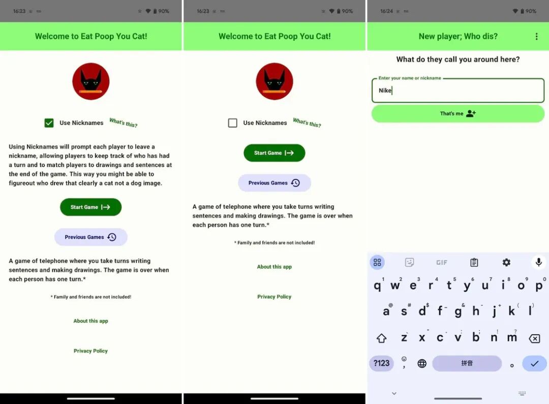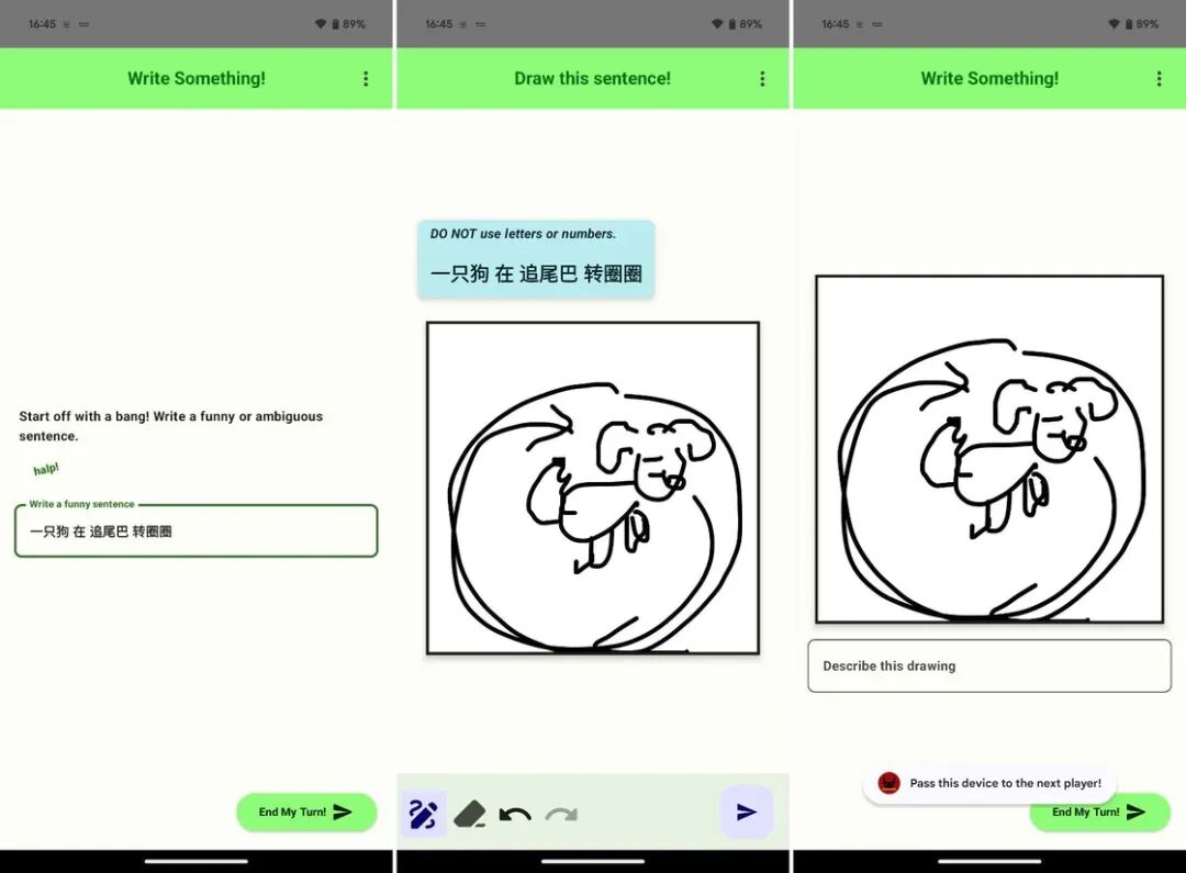 这样一来,经过句子-图画-句子-图画的轮番传递,当游戏结束时,最终会呈现原始的句子和最终生成的图画以供对比(爆笑)。整个游戏过程都要通过同一部手机传递,在游戏开始前,玩家们可以选择是否需要填写昵称,填写昵称的好处是方便追溯每一个句子和每一幅图画出自谁手,当然我们也可以选择完全匿名。