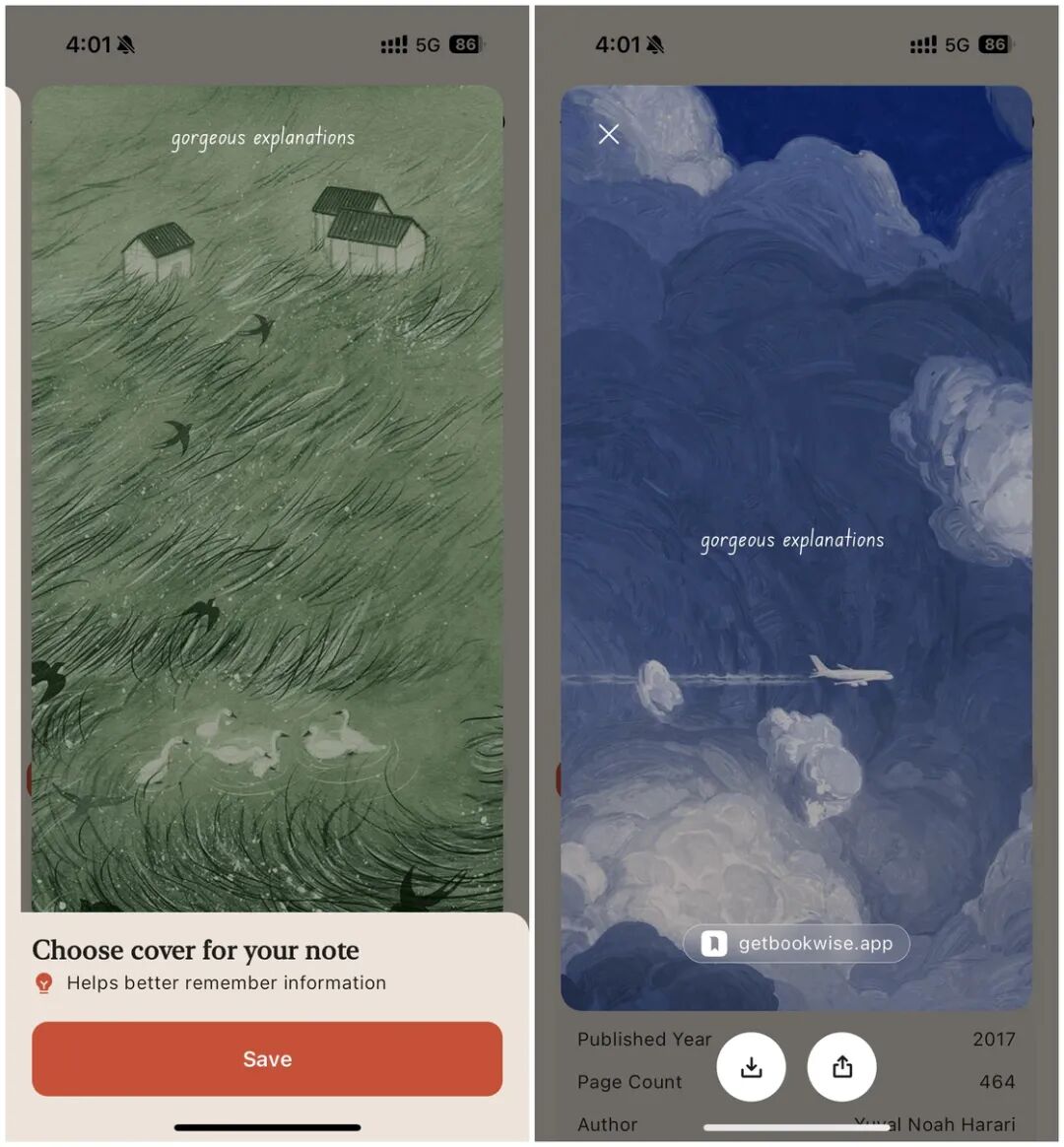 除此之外,我们还可以对这本书添加笔记,然后将笔记添加一个封面进行分享,Bookwise 内置了多款好看的封面可供选择。