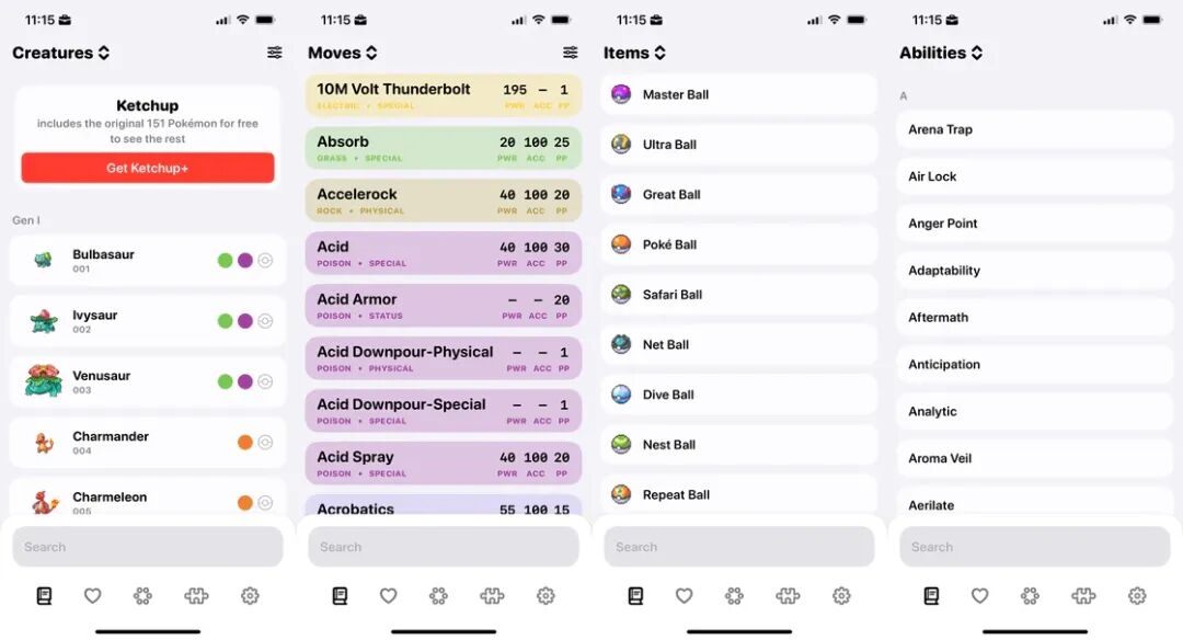 Ketchup 作为一款宝可梦的辅助工具 app (目前只有英文版),作用就是让初入坑玩家能够在拿到游戏中的一个物品后立刻找到它的作用。App 分为四大类,分别是宝可梦图鉴、招式表、物品、能力所属。