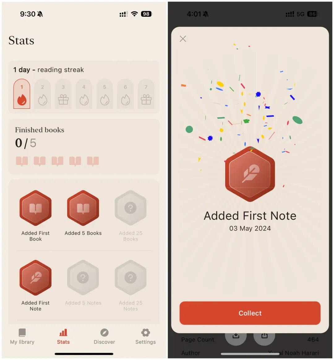 在第二个标签页中,我们可以看到一些阅读状态,包括了连续阅读天数、已完成阅读本数以及得到的一些成就徽章。