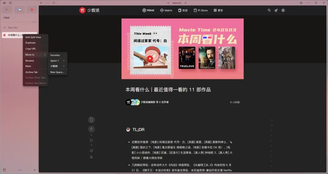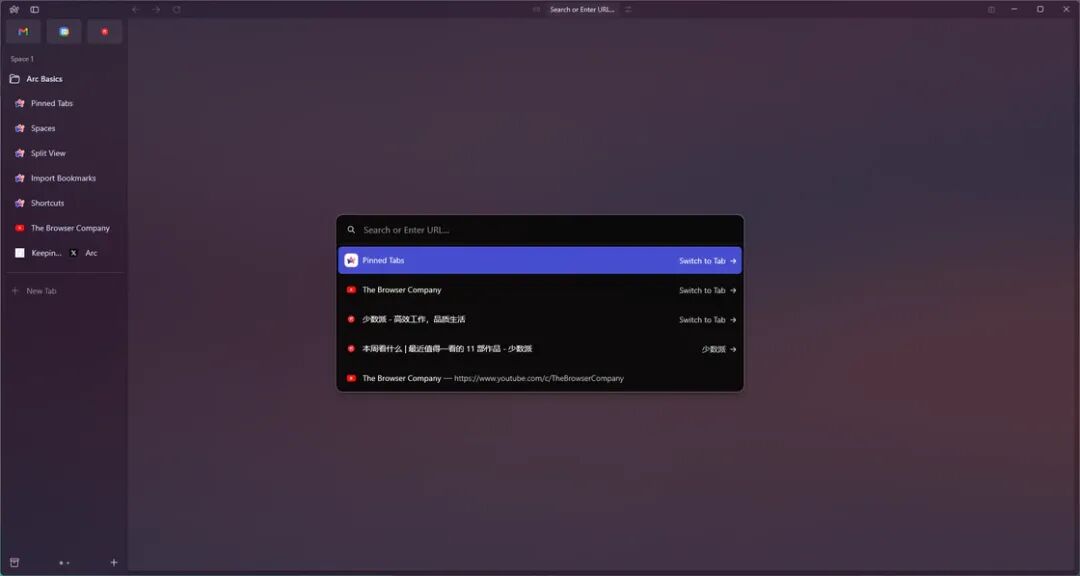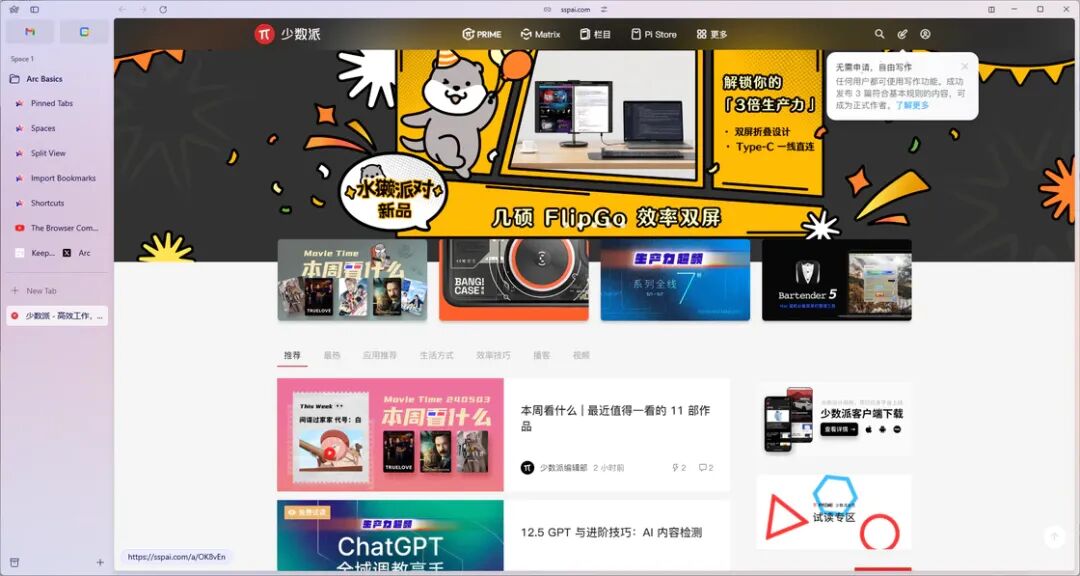 回到功能上,登录或者注册账号后就会直接进入到浏览器中,Windows 版本整体的布局和 macOS 版本并无太大区别,如果你曾经接触过 macOS 上的 Arc 浏览器,那么在 Windows 版的 Arc 浏览器几乎继承了其 80% 的功能。