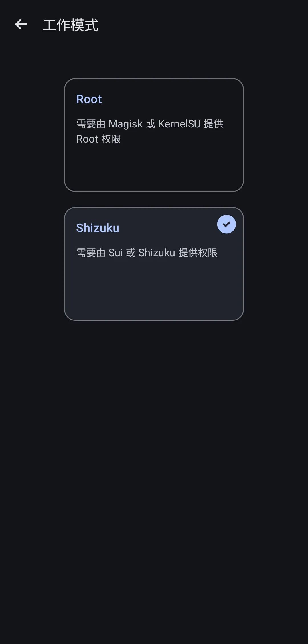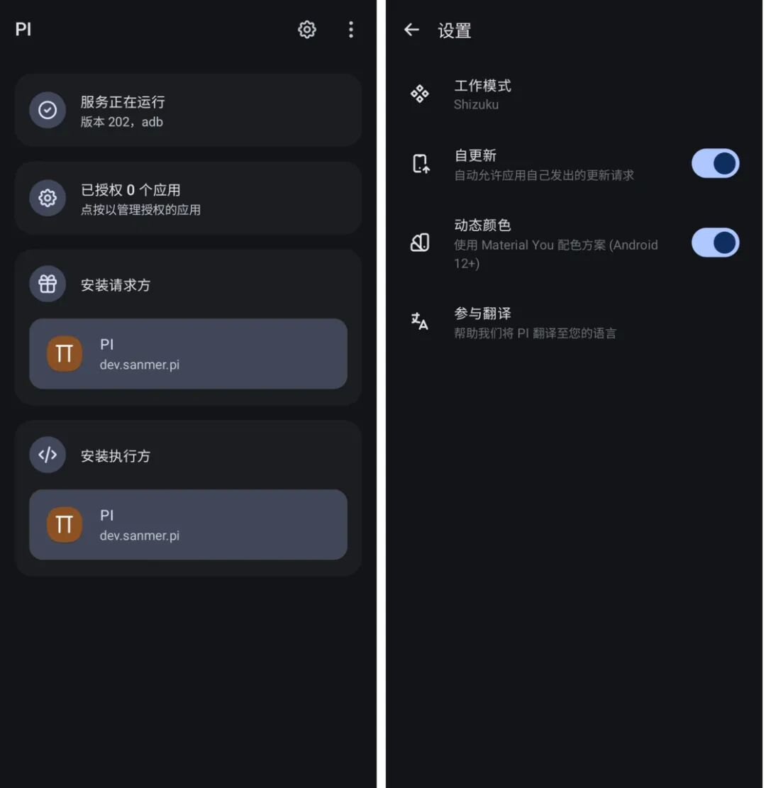 要知道,这种 APK 安装器类的工具与普通 App 不同,它们必须获得一定的系统权限才能安装 APK,所以 PI 提供了两种获取高级权限的方式,一种是通过 Shizuku 授权,另一种则是直接拿到 ROOT 权限。在这里我们建议使用 Shizuku 的方式,有关于 Shizuku 的介绍可以参考这篇文章。