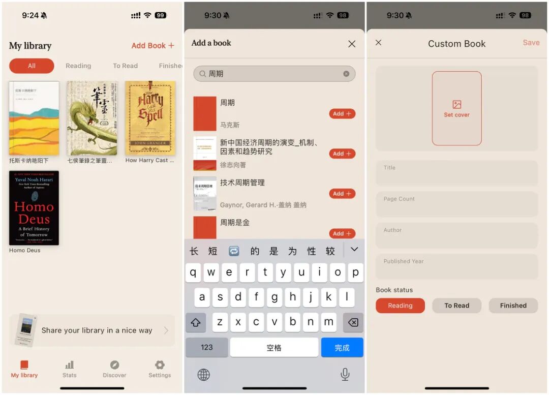 打开 Bookwise 后,第一个标签页 My Library 就是最主要的书库功能,我们可以在这里添加和管理书籍。根据我自己的测试,目前 Bookwise 支持搜索大部分的中外书籍,但是对新书的支持还不是很到位,我搜索了一部分豆瓣新书速递中的书籍,有一部分无法搜到,对于这一类书籍可以自己手动添加。