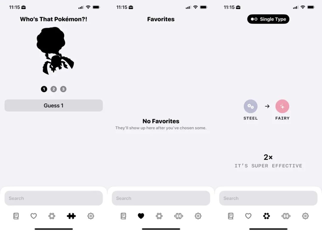 除了上述的主要功能,app 还可以查看宝可梦之间的属性克制、收藏自己喜欢的宝可梦。最有意思的功能是「猜猜我是谁」。玩家可以在 app 内享受看剪影猜宝可梦的游戏,梦回童年动画。
