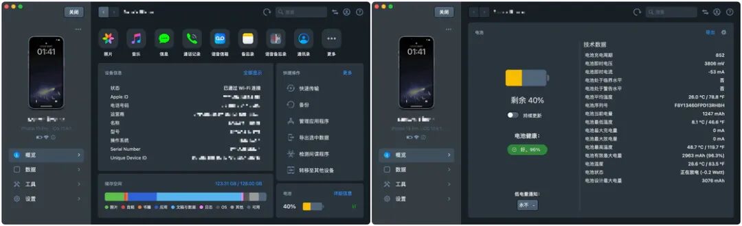 此次 UI 更新,还涉及许多数据展现上的优化。例如,目前单设备预览页可以展现更丰富的设备信息;储存空间除原有的进度条状展现及数据列表外,还增加了环形图展示,iCloud 暂存数据也有更清晰的展示;电池状况也由上一版的弹窗更改为独立页面,设备数据一目了然。此外,操作历史也由单独弹窗更改为应用主屏中弹出的侧边栏,操作进度条会与其他历史同时显示,不会再出现误关进度条后找不到的问题。