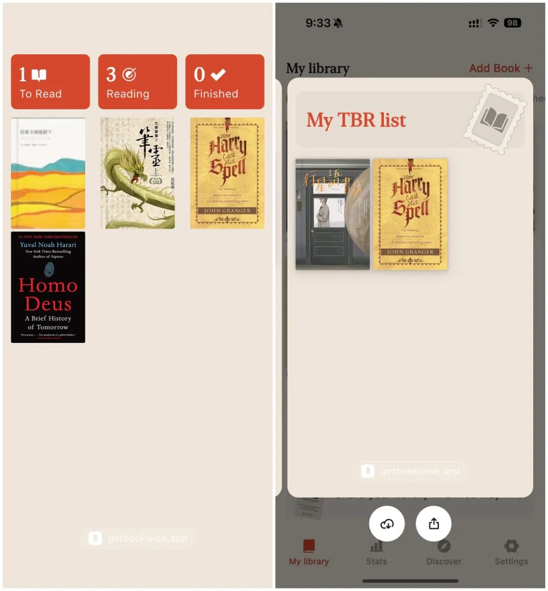每一本书籍都可以对其添加阅读中、待阅读、已完成等标签,打上标签后这些书籍就会被分类到相应的标签中。我们还可以对整个书库或者待阅读清单的书籍进行分享,Bookwise 会帮你生成一张书库的图片,你可以选择下载至相册或者直接通过分享菜单进行分享。