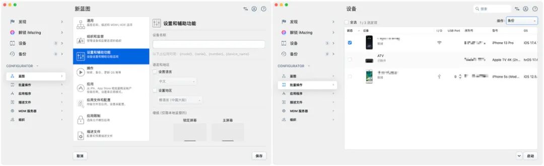 借助左侧栏中的 Configurator 工具,你还可以为大批量设备预设统一的组织信息,配置统一的语言、壁纸,启用单应用模式,统筹应用限制,安装描述文件等,如果你是一家公司的设备管理者,iMazing 3 可以帮助你大幅提升管理效率。
