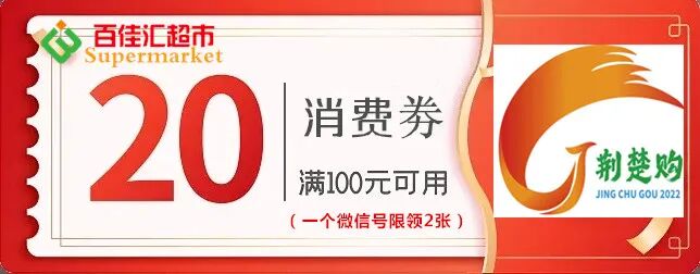 9月8日至10日,可进入百佳汇超市微信小程序上领取20元消费劵,9月8日-10日单笔购物消费满100元立减20元消费劵。(注:烟酒类不参加此活动)