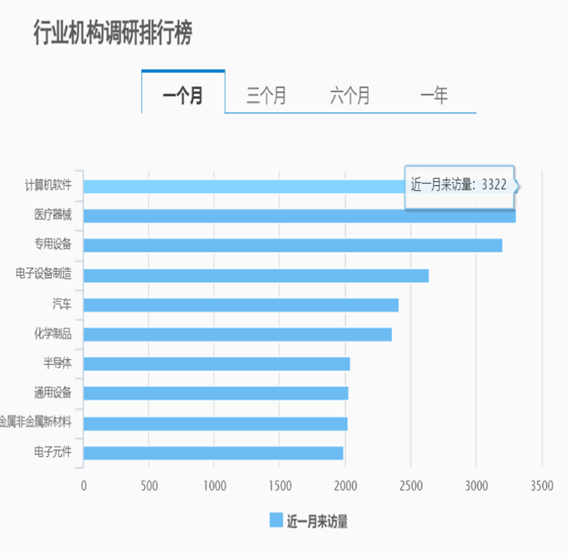 Choice数据显示,近一个月,机构调研次数超过5万次,处于历史较高水平。从具体调研方向看,计算机软件机构调研次数超过3000次,医疗器械、专用设备机构调研次数也在3000次以上。