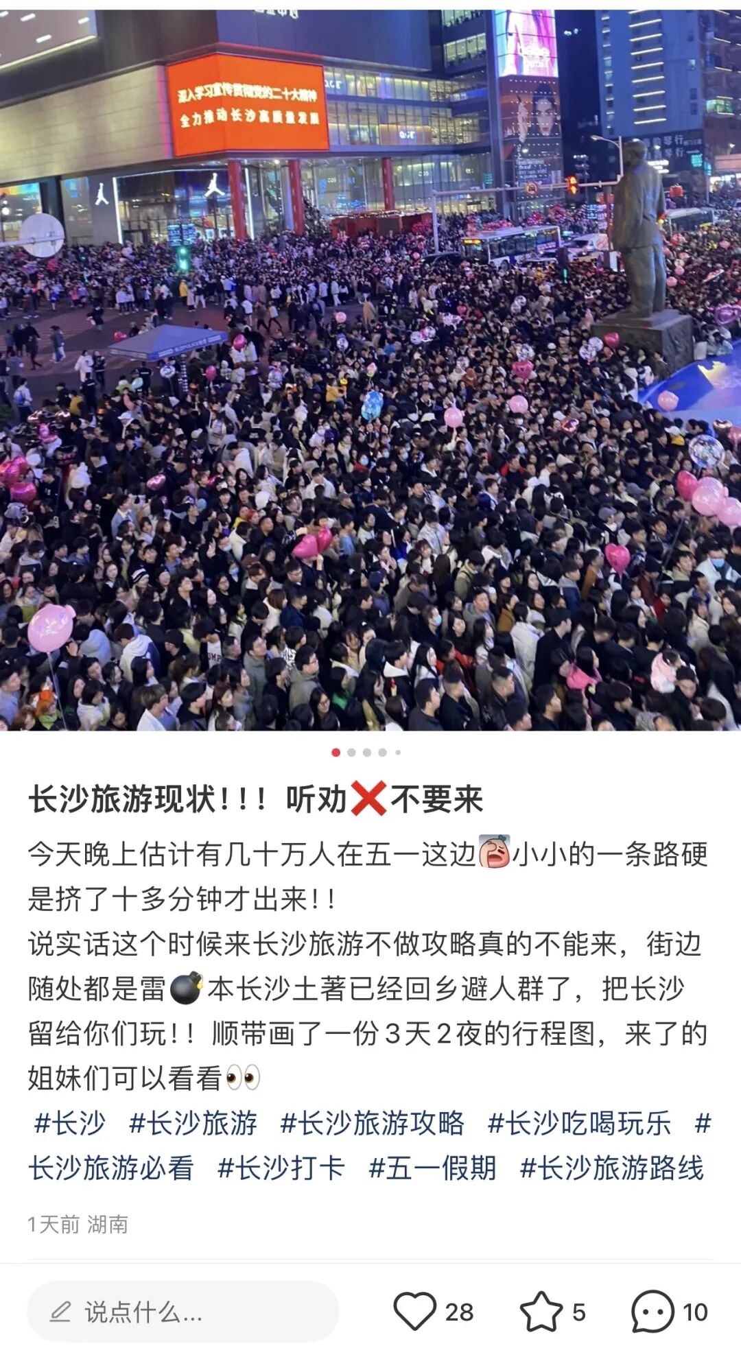 还有长沙的网友表示:“小小的一条路硬是挤了十多分钟才出来……本长沙土著已经回乡避人群了,把长沙留给你们玩!”