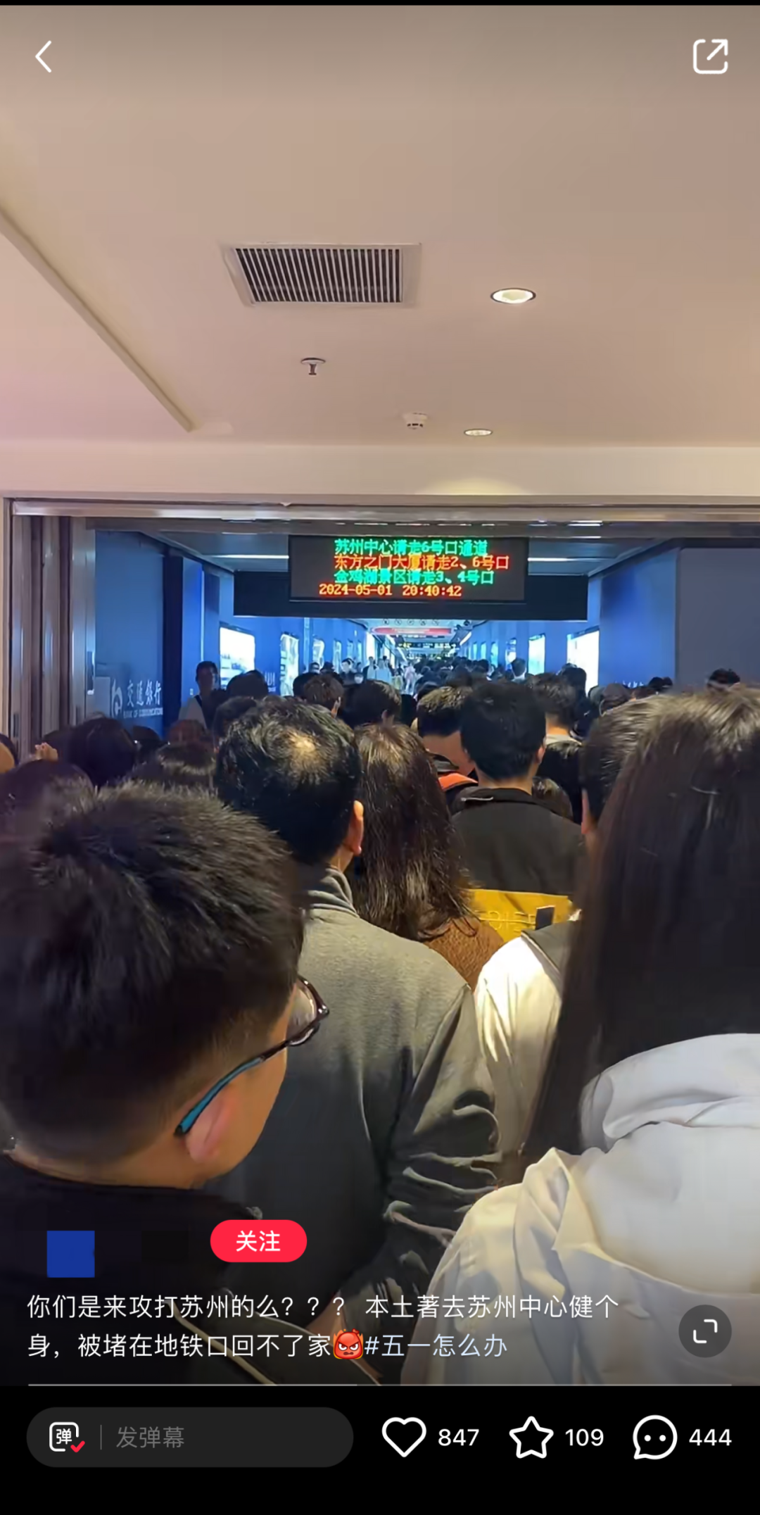 苏州的网友发布视频称自己出门健身,被堵在地铁口“回不了家”。