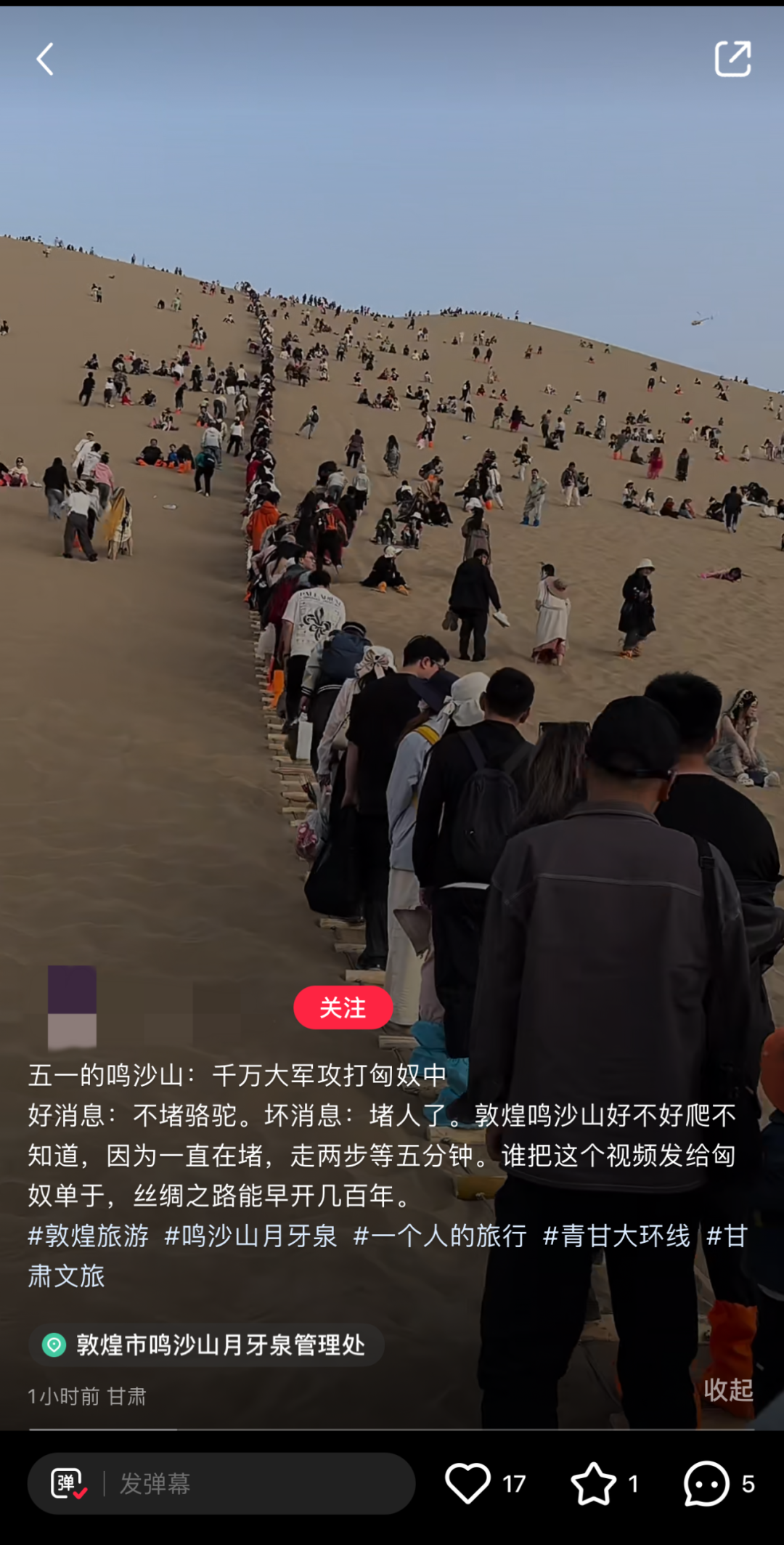 有甘肃的网友在发布的关于敦煌鸣沙山的笔记中称:“好消息:不堵骆驼。坏消息:堵人了……走两步路等五分钟。”