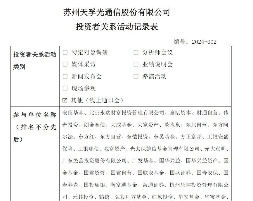 以天孚通信为例,在该公司4月24日举办的投资者交流活动中,天弘基金、易方达基金、银华基金、中欧基金、星石投资、同犇投资、玄元投资、银叶投资等公私募积极现身调研。