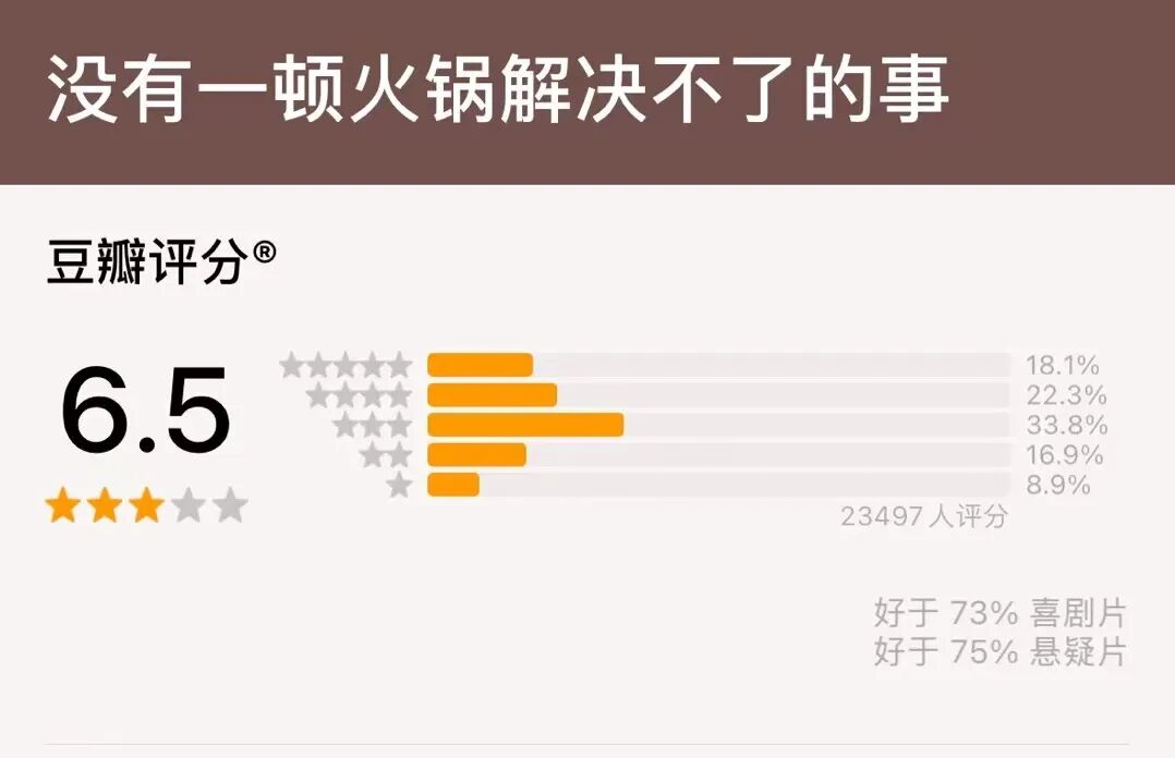 豆瓣App显示,目前共有超23000人给《没有一顿火锅解决不了的事》评分,该影片目前评分为6.5分。部分网友表示该影片“一言难尽”。