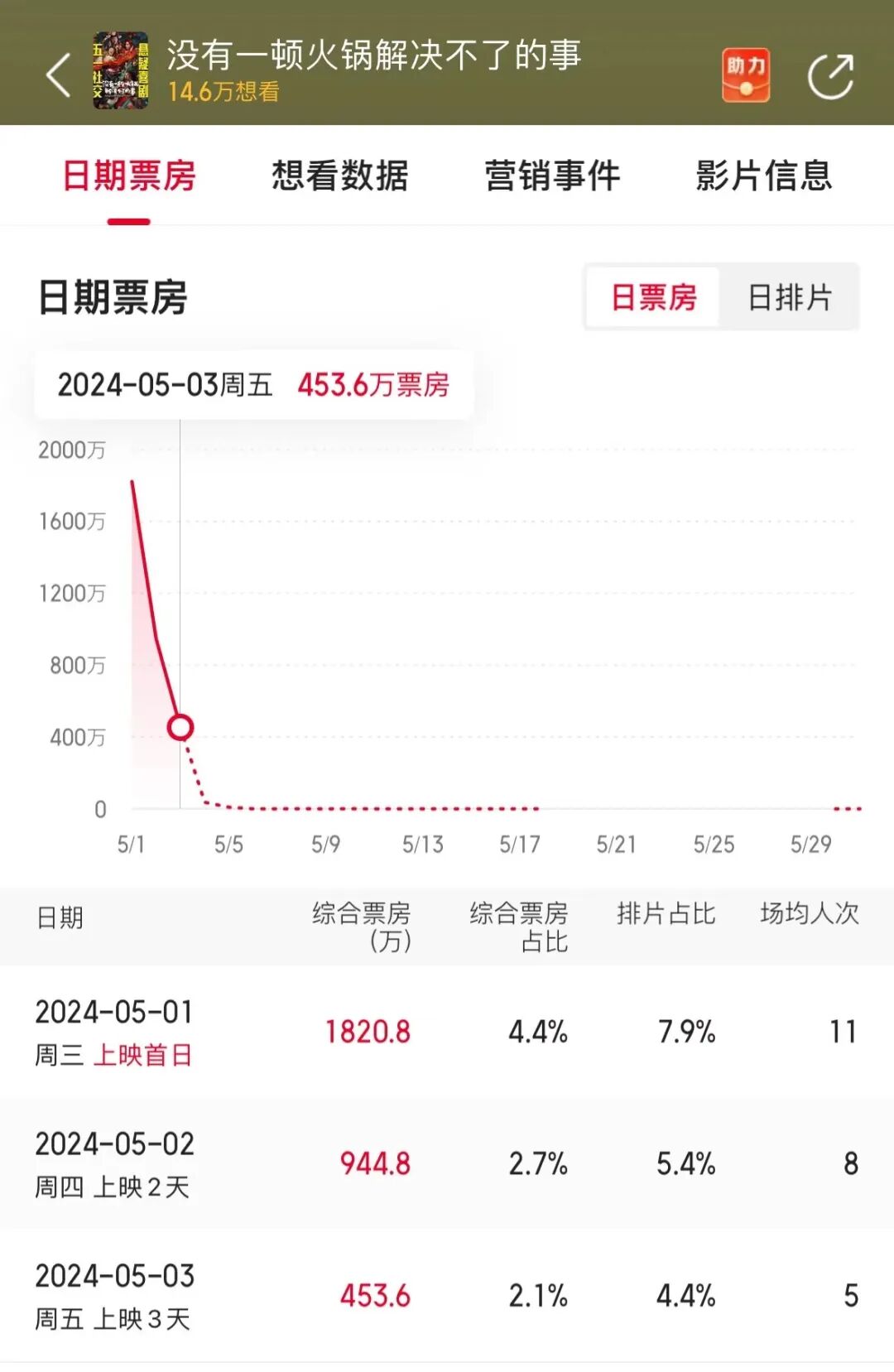 日期票房显示,该部影片上映首日综合票房约为1820.8万元,第二日便下跌至944.8万元,几近“腰斩”,随后更是不断下滑。截至发稿,《没有一顿火锅解决不了的事》上映三天总票房约为4593.83万元。