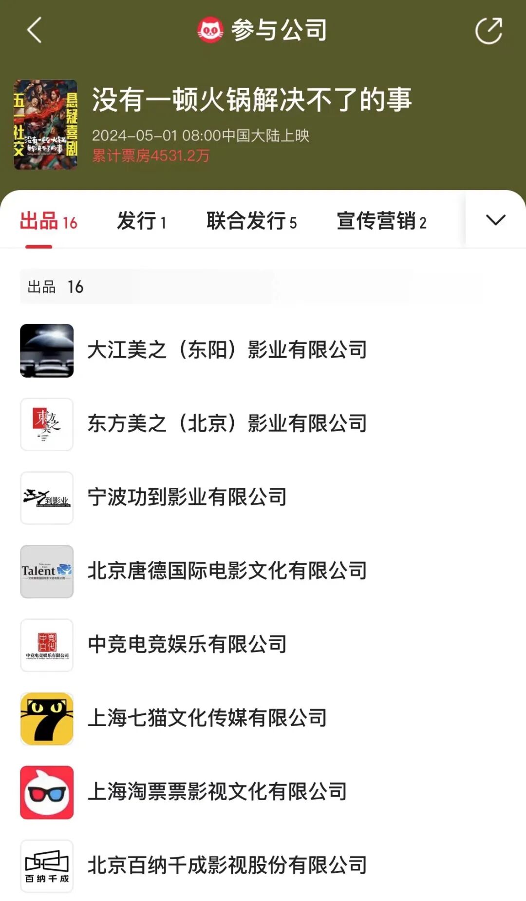 《没有一顿火锅解决不了的事》的背后出品方多达16家,其中也不乏唐德影视、百纳千成等上市公司。