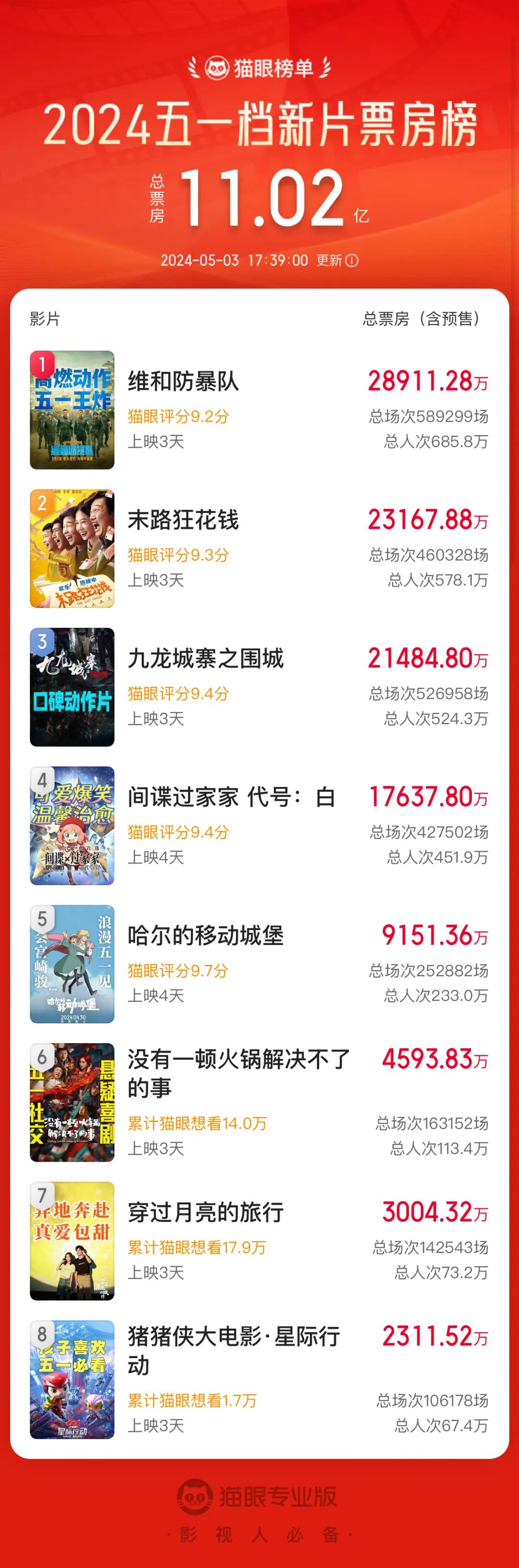 今年的“五一档”十分火热。据猫眼专业版,截至5月3日17:39,2024“五一档”新片总票房(含点映及预售)已超11亿元。