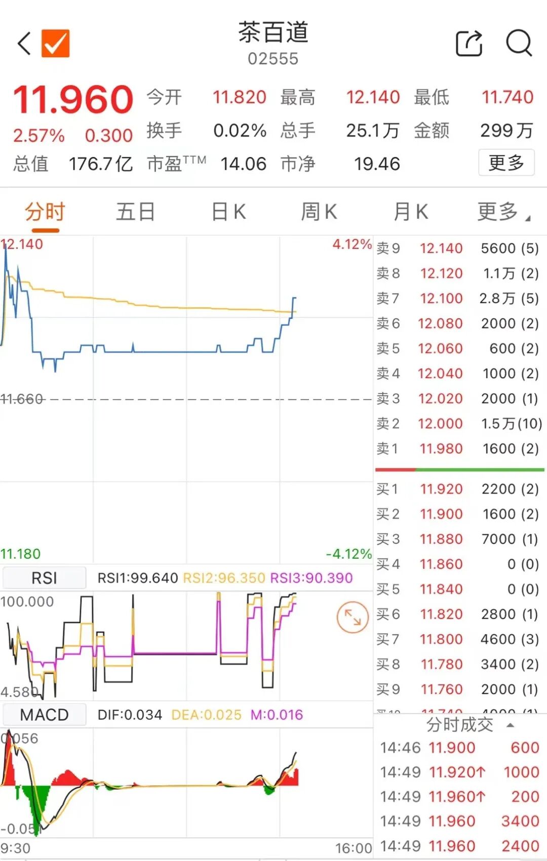 截至发稿,港股茶百道最新股价为11.96港元/股,涨超2%,最新市值约为176.7亿港元。