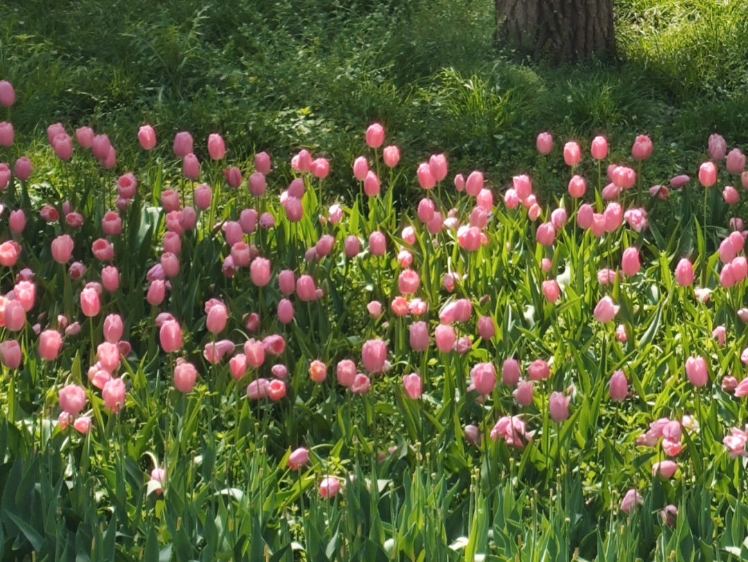 “五一假期的阳光格外明媚,我和朋友来到了城市中的一片绿洲——中山公园。在这里,郁金香竞相开放,宛如一幅五彩斑斓的画卷。它们颜色各异,红的似火、粉的似霞、白的如雪,每一种颜色都散发着独特的魅力。微风吹过,花海轻轻摇曳,散发出阵阵芬芳,洗去城市的喧嚣与疲惫。