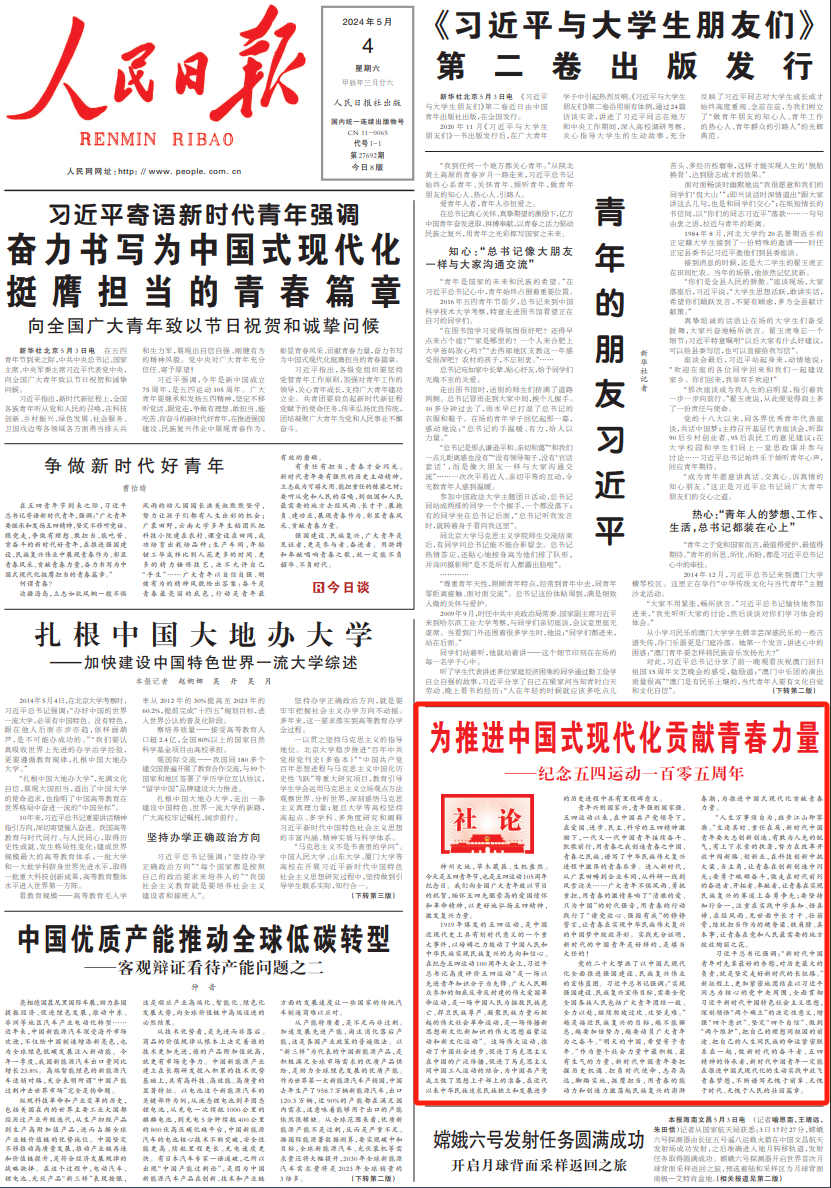 神州大地,草木葳蕤、生机盎然。今天是五四青年节,也是五四运动105周年纪念日。我们向全国广大青年致以节日的祝贺,缅怀五四先驱崇高的爱国情怀和革命精神,以更好地弘扬五四精神,激发复兴力量。1919年爆发的五四运动,是中国近现代史上具有划时代意义的一个重大事件,以磅礴之力鼓动了中国人民和中华民族实现民族复兴的志向和信心。在纪念五四运动100周年大会上,习近平总书记高度评价五四运动“是一场以先进青年知识分子为先锋、广大人民群众参加的彻底反帝反封建的伟大爱国革命运动,是一场中国人民为拯救民族危亡、捍卫民族尊严、凝聚民族力量而掀起的伟大社会革命运动,是一场传播新思想新文化新知识的伟大思想启蒙运动和新文化运动”。这场伟大运动,推动了中国社会进步,促进了马克思主义在中国的广泛传播,促进了马克思主义同中国工人运动的结合,为中国共产党成立做了思想上干部上的准备,在近代以来中华民族追求民族独立和发展进步的历史进程中具有里程碑意义。青年兴则国家兴,青年强则国家强。五四运动以来,在中国共产党领导下,在爱国、进步、民主、科学的五四精神激励下,一代又一代中国青年接续奋斗、凯歌前行,用青春之我创造青春之中国、青春之民族,谱写了中华民族伟大复兴进程中激昂的青春乐章。进入新时代,从广袤田畴到企业车间,从科研一线到风雪边关……广大青年不惧风雨、勇挑重担,用青春的激情奏响了“清澈的爱、只为中国”的时代强音,用青春的行动践行了“请党放心、强国有我”的铮铮誓言,让青春在实现中华民族伟大复兴的中国梦中绽放异彩。实践充分证明,新时代的中国青年是好样的,是堪当大任的!党的二十大擘画了以中国式现代化全面推进强国建设、民族复兴伟业的宏伟蓝图。习近平总书记强调:“实现强国建设、民族复兴宏伟目标,需要全党全国各族人民包括广大青年团结一致、全力以赴,继续爬坡过坎、攻坚克难。”越是接近民族复兴的目标,越不能懈怠,越要加倍努力,越要动员广大青年为之奋斗。“明天的中国,希望寄予青年。”作为整个社会力量中最积极、最有生气的力量,新时代中国青年要把握历史机遇、担负时代使命,志存高远,脚踏实地,挺膺担当,用青春的能动力和创造力激荡起民族复兴的澎湃春潮,为推进中国式现代化贡献青春力量。“人生万事须自为,跬步江山即寥廓。”生逢其时、重任在肩,新时代中国青年要矢志创新创造,有敢为人先的锐气,有上下求索的执著,努力在改革开放中闯新路、创新业,在科技创新中挑大梁、当主角,让青春在创新创造中闪光;要勇于砥砺奋斗,做走在时代前列的奋进者、开拓者、奉献者,让青春在实现民族复兴的赛道上奋勇争先;要坚持知行合一,注重在实践中学真知、悟真谛,在经风雨、见世面中长才干、壮筋骨,练就担当作为的硬脊梁、铁肩膀、真本事,让青春在党和人民最需要的地方绽放绚丽之花。习近平总书记强调:“新时代中国青年对先辈最好的告慰,对历史最大的负责,就是坚定走好新时代的长征路。”新征程上,更加紧密地团结在以习近平同志为核心的党中央周围,全面贯彻习近平新时代中国特色社会主义思想,深刻领悟“两个确立”的决定性意义,增强“四个意识”、坚定“四个自信”、做到“两个维护”,把自己的理想同祖国的前途、把自己的人生同民族的命运紧密联系在一起,做新时代的奋斗者、五四精神的传承者,新时代中国青年一定能在推进中国式现代化的生动实践中放飞青春梦想,不断谱写无愧于前辈、无愧于时代、无愧于人民的壮丽篇章。