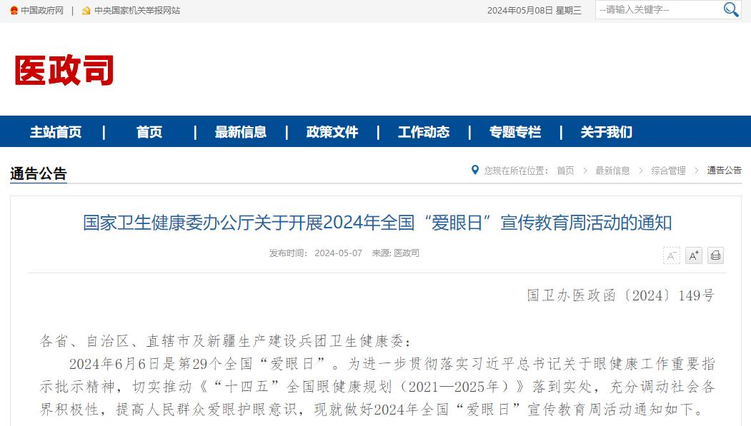 2024年6月6日是第29个全国“爱眼日”。为进一步贯彻落实习近平总书记关于眼健康工作重要指示批示精神,切实推动《“十四五”全国眼健康规划(2021—2025年)》落到实处,充分调动社会各界积极性,提高人民群众爱眼护眼意识,现就做好2024年全国“爱眼日”宣传教育周活动通知如下。