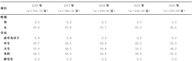据《2016-2020年我国护士人力资源公平性研究》中关于我国注册护士学历变化的数据显示:高中及以下占比最低,且逐年下降;中专占比逐年降低,但仍较高;大专占比逐年降低,但仍为最高;本科占比逐年上升,2020年达到31.9%;研究生占比最低,但呈现上升趋势。