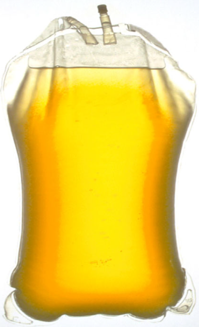 糖尿病视网膜病变筛查检查,荧光素眼底血管造影术,可能会导致腹透液呈亮黄色,黑暗处可见淡淡的荧光色(图6)。