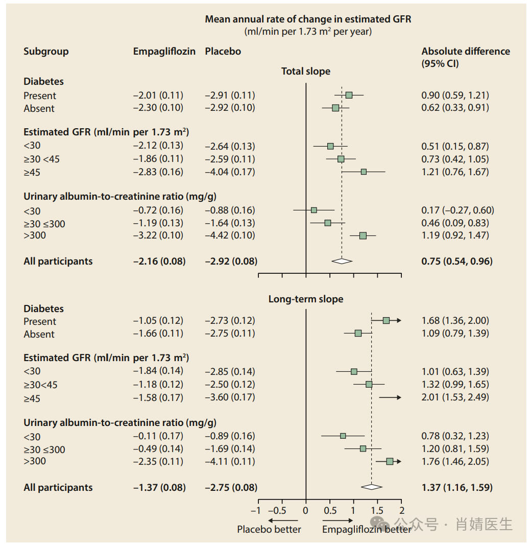 图25 | 恩格列净与安慰剂对心脏和肾脏保护研究中关键亚组估计肾小球滤过率(GFR)年变化率的影响。CI,置信区间。