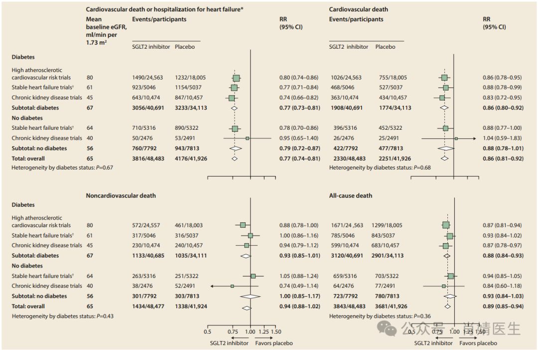 相同的荟萃分析显示,尽管在没有糖尿病的CKD患者中发生心血管事件的人数有限,与安慰剂相比,无论糖尿病状况如何,应用SGLT2i的患者心血管死亡或因心力衰竭住院的风险降低了23%(图23) 。