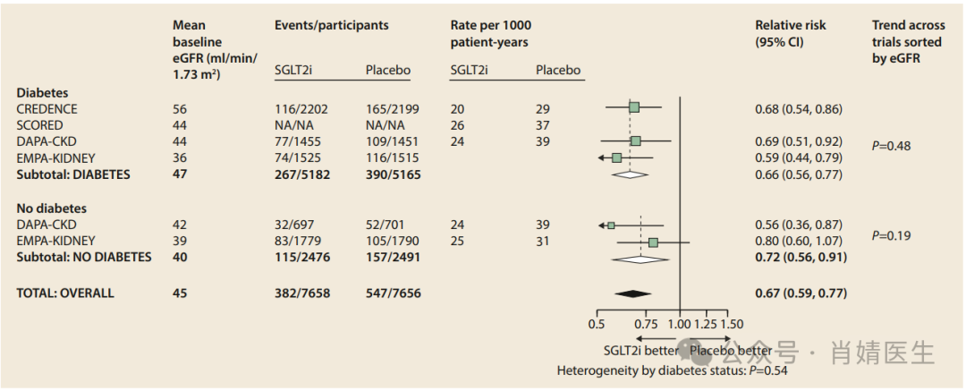 在一项协作Meta分析中,包括这2项和11项其他试验(13项试验,有90000多名随机参与者),与安慰剂相比,分配给SGLT2i的患者,无论糖尿病状态如何,肾脏疾病进展风险降低37%,AKI风险降低23%(图22)。