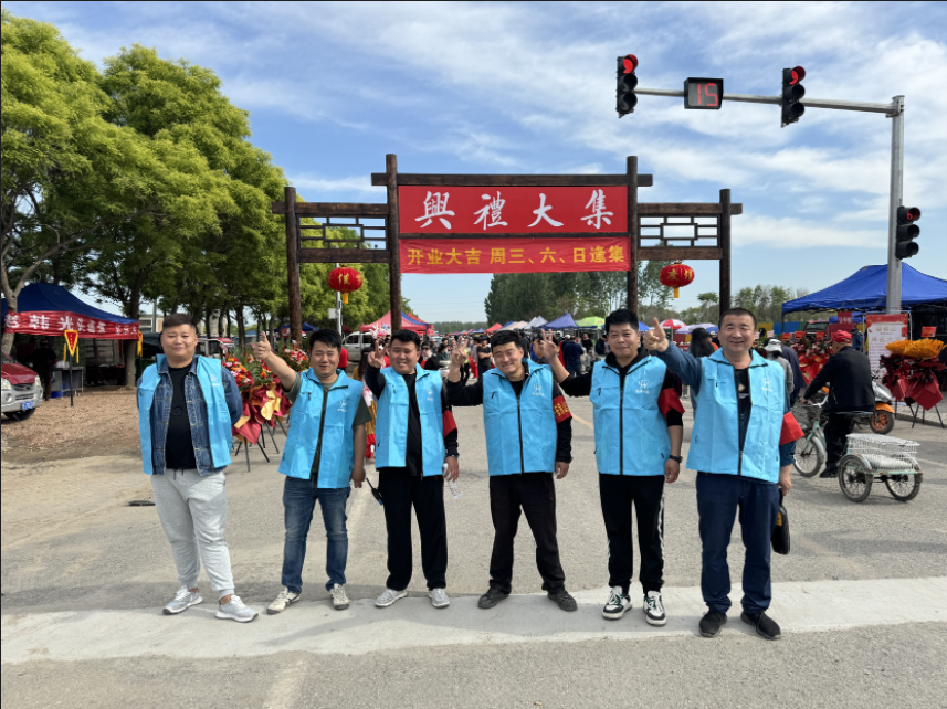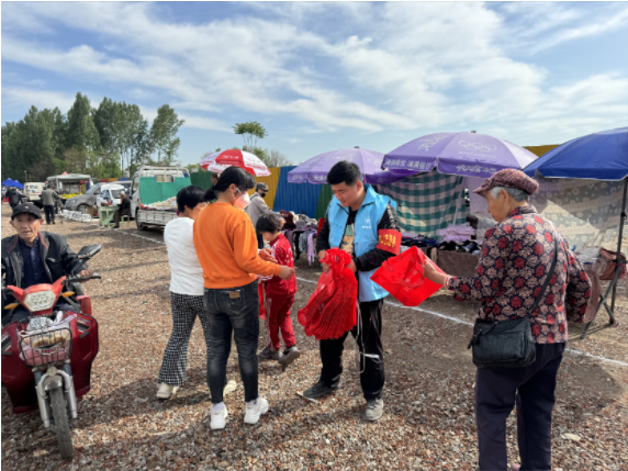 指挥交通、摆放花篮、铺设农产品展台、宣传特色农产品……蓝色身影穿梭在大集来往的人群中相互搭配、团结协作,为商户和群众送上温暖。同时向群众宣传垃圾入桶,文明同行的卫生环保理念,并向赶集群众发放环保购物袋,倡导大家文明逛大集,有序逛大集。