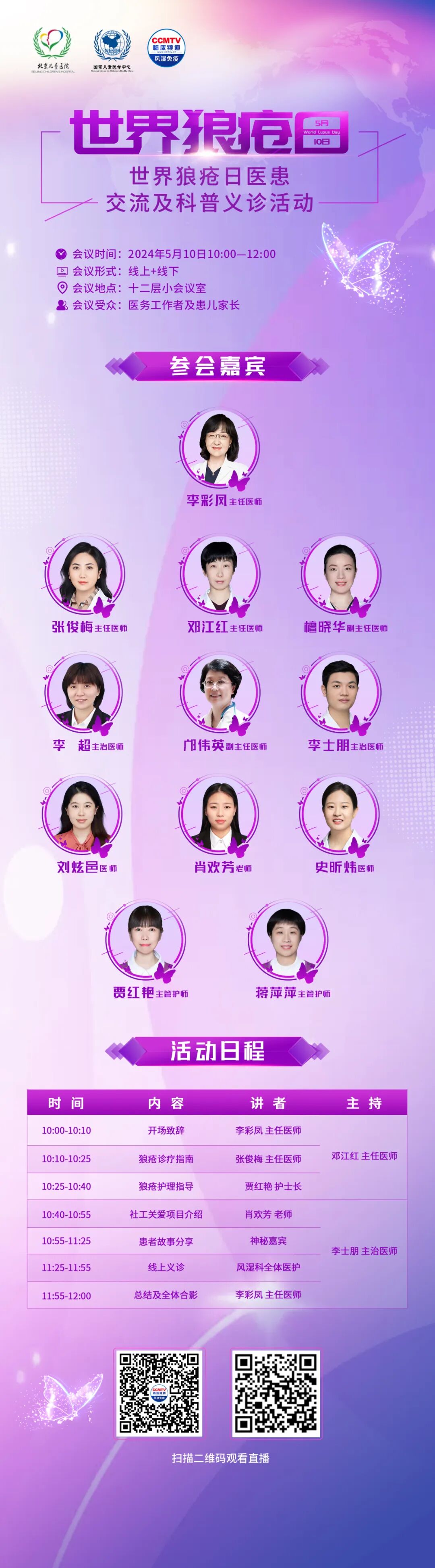 摘要:为了提高社会对系统性红斑狼疮(SLE)的认知,关爱狼疮患者,并推动该病的早诊早治,北京儿童医院风湿科将在“世界狼疮日”这一天举办系列活动。