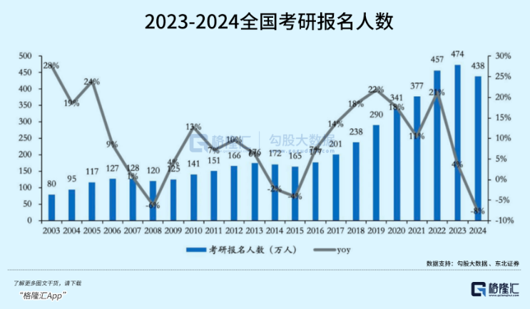 临近毕业季,表弟在群聊里说自己很迷茫,不知道自己该做什么。除了医学之类的特殊专业,读研等于是把问题往后退,过两年还是要选择后两者。在过去,大学生毕业肯定是优先找工作,考研是次一级的选择。本人是2017年毕业的,印象中同届校友、往届学长,选择考研的确实是少数,大家基本都是大三就开始找实习,早点积累工作经验。恰好也是从2017年开始,中国考研人数以十分夸张的速度暴增。今年虽然降了点,但依然高达438万。多在校园待几年,不仅可以学到更多知识,还能继续享用几百块一年的宿舍、廉价的食堂,以及仅存于学生时代的青涩爱情。你22岁去找工作,大家是允许你什么都不会的,而且很乐于教你。但25、甚至快30岁的时候,就完全不是那么一回事。尤其是,当你发现有些同龄人已经事业小成,你只会更焦虑。更难受的是,你当初考研的时候,某些行业还挺热门的。结果等你硕士毕业,这个岗位都没了。当然,考上了,并读完研、读完博出来,再差也差不到哪去,中国社会对高学历还是有些偏爱的。我最近潜伏在一个互帮互助学习群,里面有相当一部分大龄青年,从大四就开始考研/考公,结果五六年都没考上。谁都知道,研究生学历能给自己镀金,也是给自己将来就业增加必要的筹码。但不是所有人的家庭条件,都支持你用至少两三年的时间,去搏一个不确定的未来。人都是现实的,年轻人要先想办法尽快找到工作先养活自己,而不是一直拖累你压力越来越大的父母。 不是大家不爱读书了,而是在自欺欺人几年后,大家开始接受现实。之前应届生想的是考个研,在学校里多躲个2~3年,等经济恢复后,再拿着一纸硕士学位走向社会大施拳脚。就业越来越难,使人倾向于更关注短期的稳定,不如早早走向社会占个坑位。