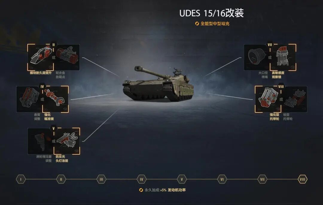 UDES 15/16属于全能型中型坦克,战地升级达到满级后可以额外获得5%发动机功率,另外可以选择5个升级选项。玩家可以考虑模块耐久度提升、强化瞄准镜、防反光头灯涂层、高敏感度观察镜和强化型托带轮,具体按玩家风格选择即可。配件方面可以考虑改进型旋转装置/输弹机/垂直稳定器/高级光学观察镜等配件以提升坦克的作战效率。