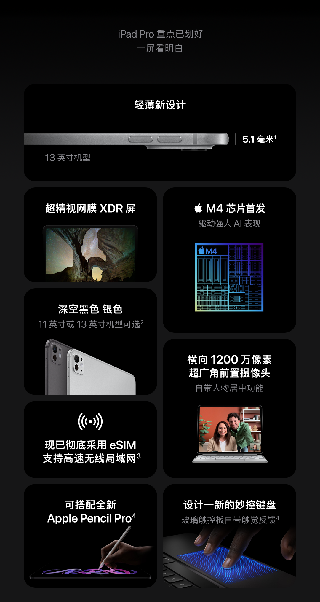 新款 iPad Pro 直接在芯片选择上「踩了一脚油门」,跳过苹果目前最新的 M3 系列芯片,首发搭载由第二代 3 纳米制程工艺打造的 M4 系列芯片。